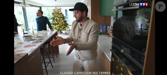Les caméras de TF1 suivent ensuite Claudio Capéo chez lui, en compagnie de ses amis qui sont aussi musiciens. On découvre le chanteur, papa de deux garçons (César 12 ans et Roméo 6 ans qu'il a eus avec sa compagne Aurélie qu'il a rencontré très jeune), en train de préparer le déjeuner dans sa cuisine. L'occasion de découvrir une partie de sa maison composée d'une jolie pièce à vivre lumineuse notamment composée d'un grand îlot central. Idéal pour recevoir et partager comme Claudio Capéo aime le faire. En arrière-plan trône un sapin de circonstance en cette période mais aussi qu'il a un extérieur... Amoureux de la musique, Claudio Capéo a un studio dans sa maison, une pièce équipée pour qu'il puisse jouer de plusieurs instruments. Un piano figure notamment dans cette pièce.